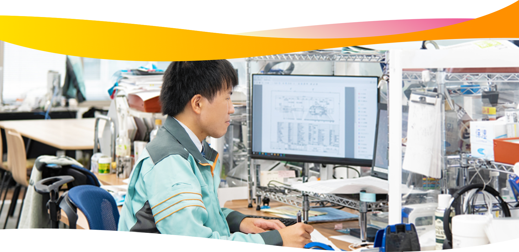 受注業務を行う上期は本社に出社し、午前中はメールの確認と返信、午後は補修工事の見積もりを確認したり、図面を見て必要な機器の見積もりを協力業者に依頼したり、基本的にデスクワークです。たまにですが、機械のトラブルなどがあったときはメーカーの方と一緒に現場へ行って対応に当たることもあります。