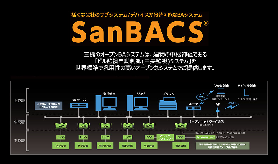 三機のオープンBAシステムは、建物を司る中枢神経である「ビル監視自動制御(中央監視)システム」を世界標準で汎用性の高いオープンなシステムでご提供します。