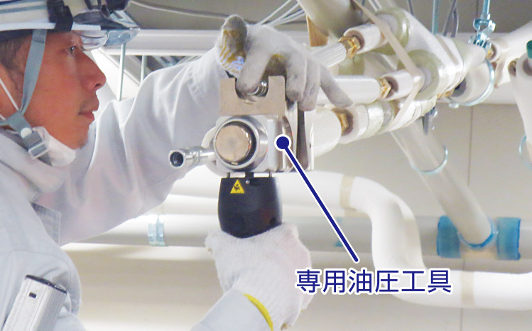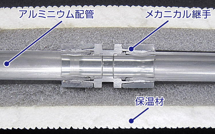 従来の銅配管の代わりにアルミニウム配管を採用し、アルミニウム配管と簡易施工型メカニカル継手をハンディ型専用油圧工具を用いて接合する工法で施工省力化を実現する技術です。