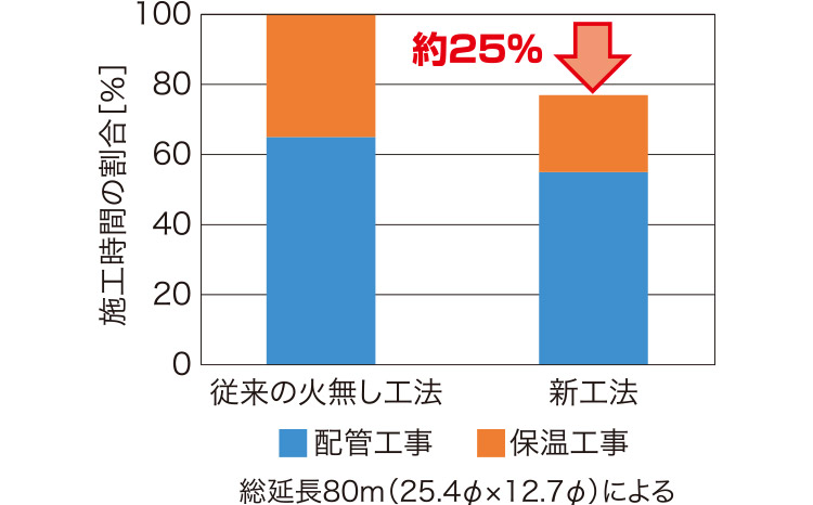 従来の銅配管の火無し工法に比べ施工性が向上し、約25%の施工時間の短縮が実現しました。これによりリニューアル現場や短工期の現場でも高品質な施工が可能です。