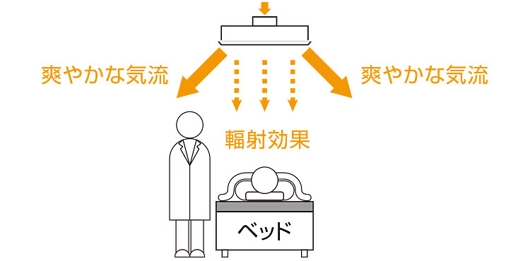今回当社が開発したMEDIFORT®(メディフォート)は、下面をパンチング吹出口、側面をスリット吹出口とする独自の構造により、患者に直接気流をあてることなく、主にベッド周辺に向けて囲い込むように空調気流を供給するよう設計されています。したがって、ベッド上の患者にはドラフトを感じることがなく、柔らかな幅射熱で冷温感が得られます。一方、見舞客や医療従事者は、爽やかな気流を感じることができます。