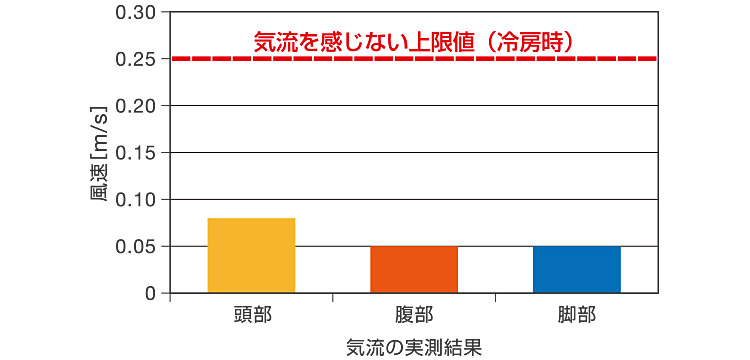 冷暖房時におけるドラフトの目安として、一般的に冷房時に0.25m/s、暖房時に0.15m/s以上の気流にあたると不快に感じると言われています。当社のバネル型吹出口では、ベッド上の気流は常に0.25m/s(冷房時)以下となり、ほとんど気流を感じることはありません。