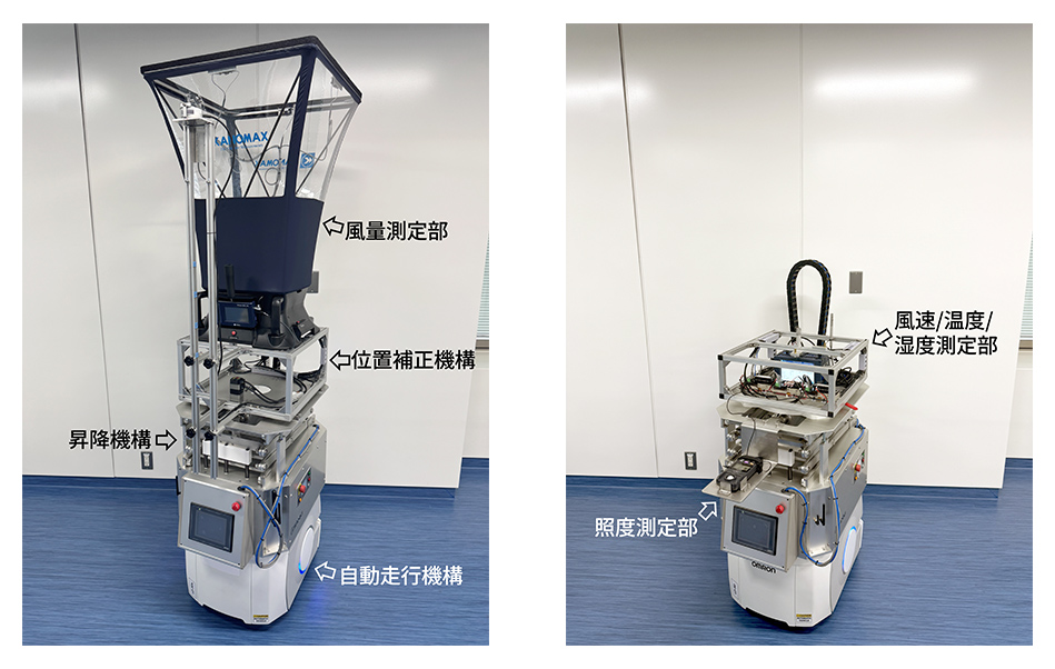 空調用吹出口と吸込口が一体化した制気口の風量計測と室内環境の総合計測が可能な複合機能計測ロボットが、建築設備工事の施工に関わる自動化・高精度化を実現します。