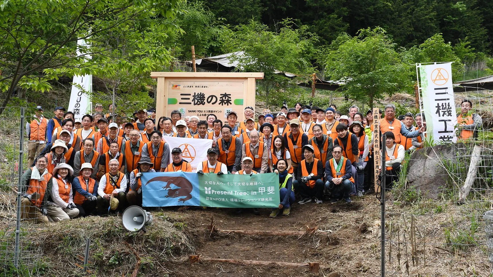 2025年5月には、創立100周年を機に「三機の森」「感謝の森」を新生「三機の森」として再整備し、当社グループ役員・従業員の約100名で植樹イベントを開催して苗木約300本を植樹しました。今後も、従業員参加の植樹活動など地域交流を通じ、森づくりとともに地域に寄り添った活動を進めていきます。