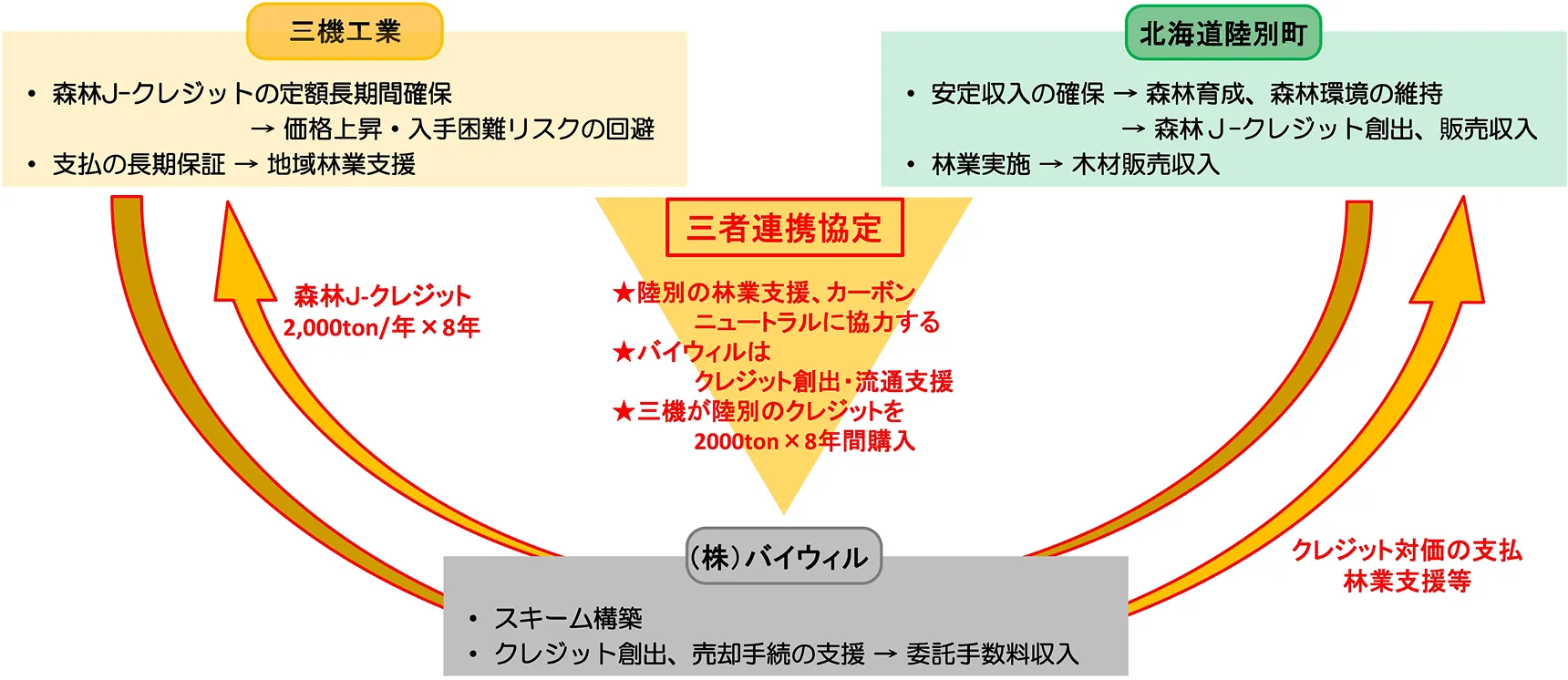 当社は2025年7月、カーボンニュートラル実現に寄与する地域林業支援のため、北海道陸別町と(株)バイウィルの3者で森林J-クレジット※に関する連携協定を締結しました。当社は、陸別町の森林J-クレジットを8年間購入することで、長期的な地域林業の支援を行っていきます。