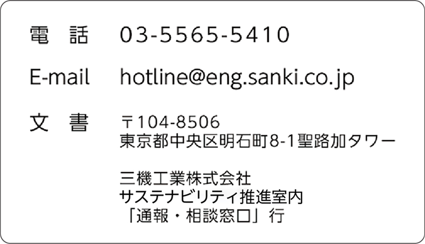 三機工業グループでは、当社グループに関係する方々からの通報や相談の窓口を設けて、速やかな問題解決を図っています。