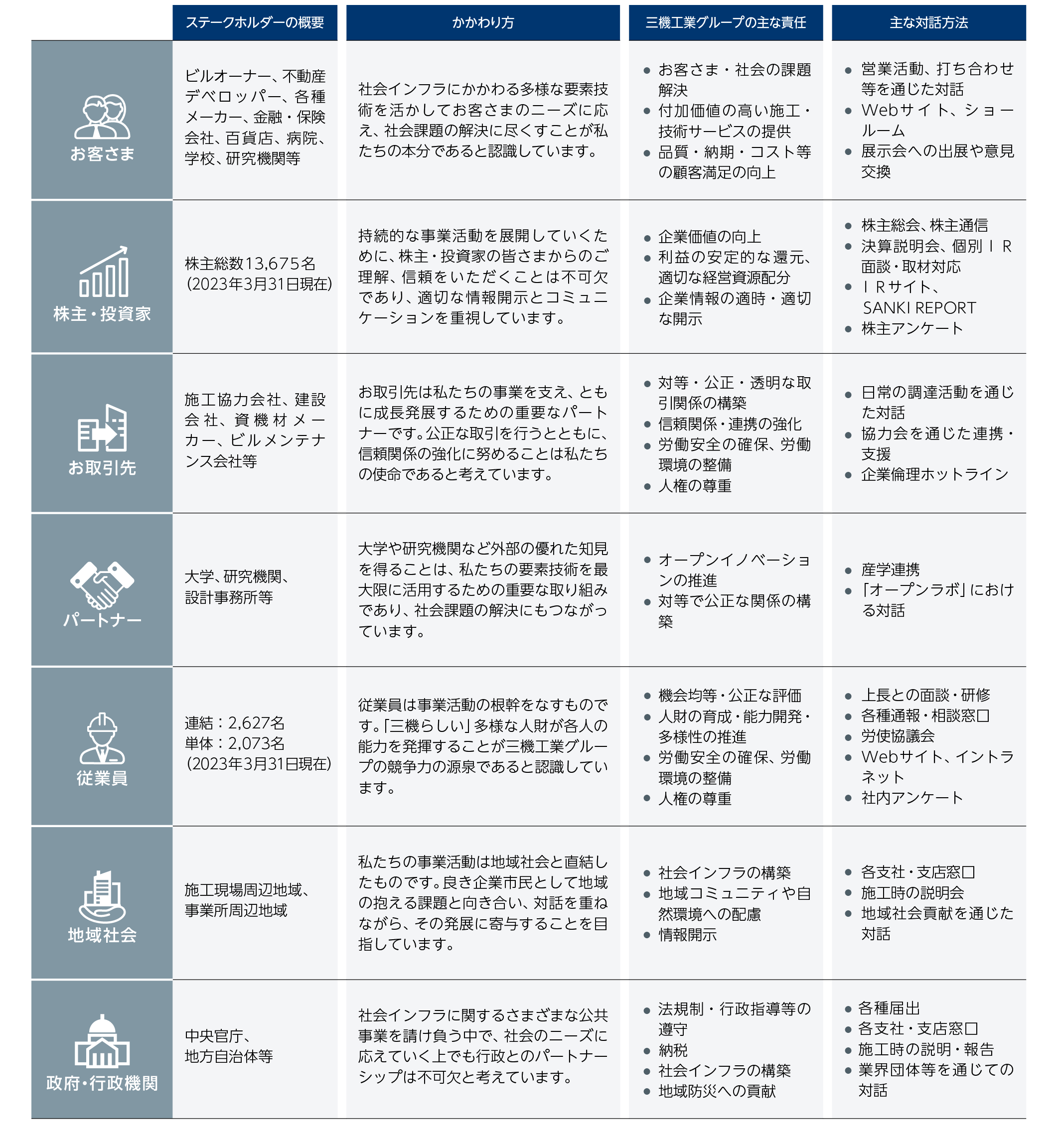 当社グループは、事業活動を行う上で、さまざまなステークホルダーとかかわりを持っています。多様なステークホルダーとコミュニケーションを図り、社会からの要請を事業活動に反映させながら、バリューチェーン全体を通してサステナビリティへの取り組みを進めています。